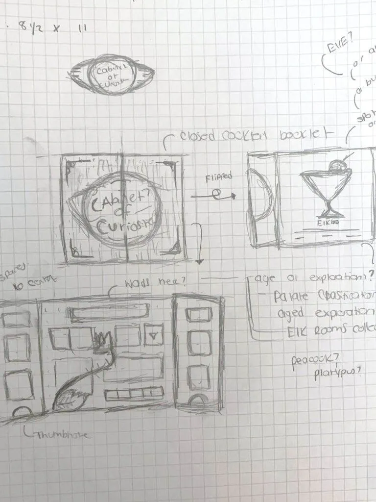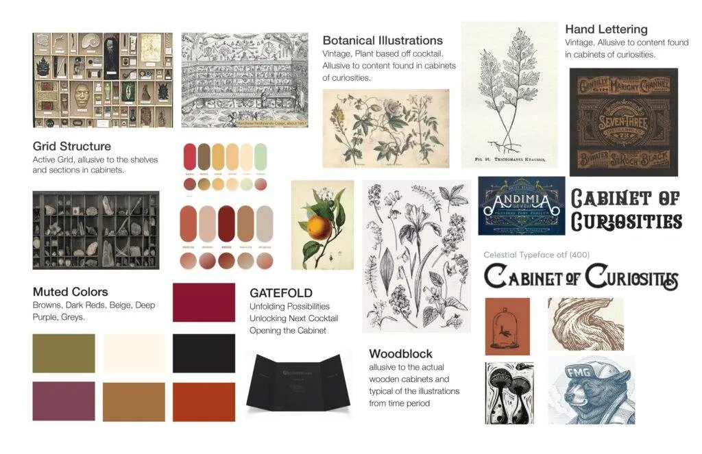 During the Ideation phase, the design team and I researched the history of cabinets of curiosities. During this research, we determined that taking an interactive approach to the menu would be an interesting take; and the best way to do that would be to make the menu a cabinet. After determining the overall layout would be cabinet-like, it was time to determine an illustration style. We researched a variety of vintage illustrations of Cabinets of Curiosities and noticed an overall trend. They all appeared to be etched. From here we started building out a mood board and picking typefaces and colors.