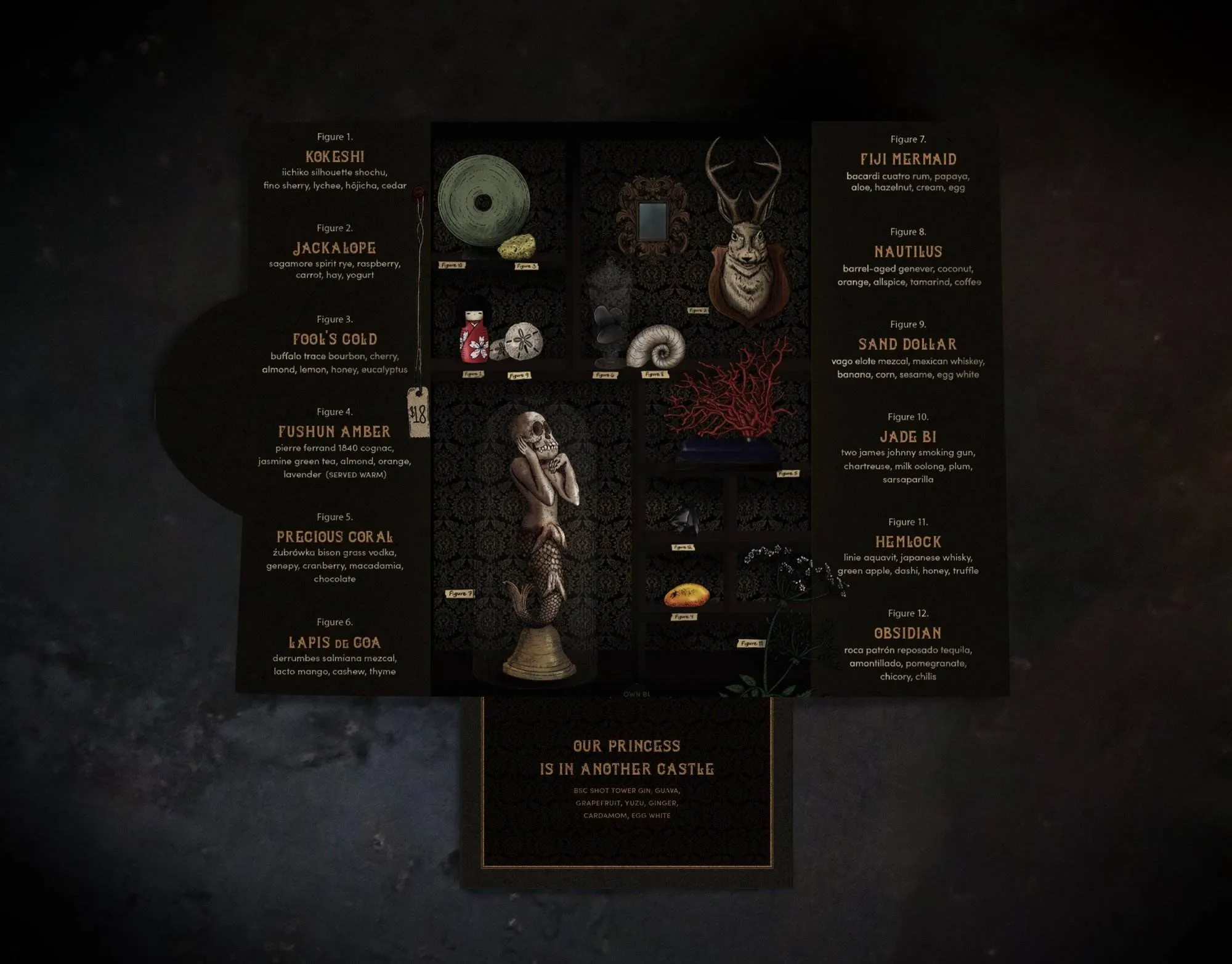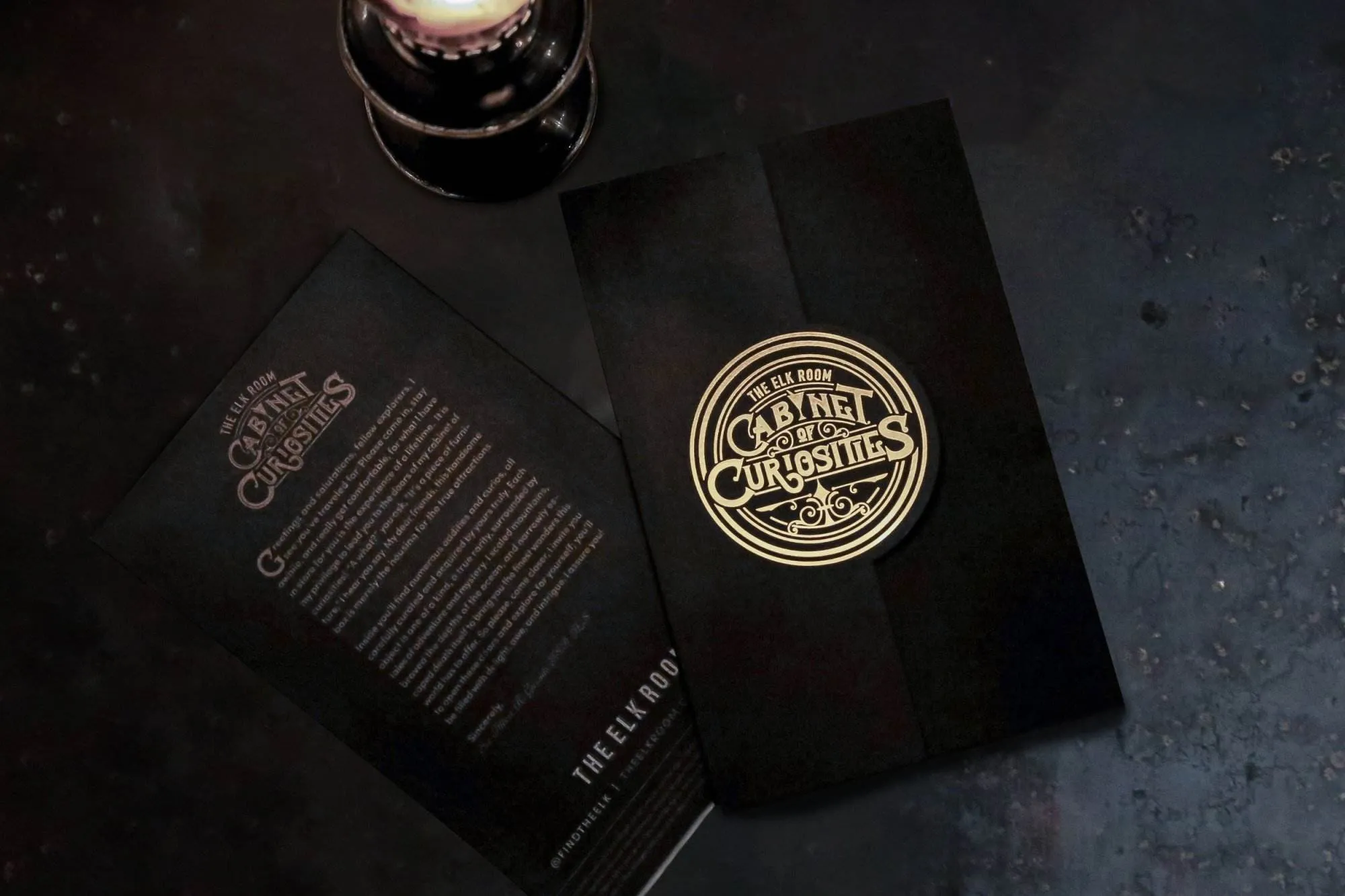 The emblematic mark can be found foiled in gold on the front of the menu. The back tells the story of this cabinet of curiosities is told from the perspective of the collector himself. Behind all of these elements, a faint wood grain texture can be found. This is done to reinforce the idea of the menu being a cabinet.