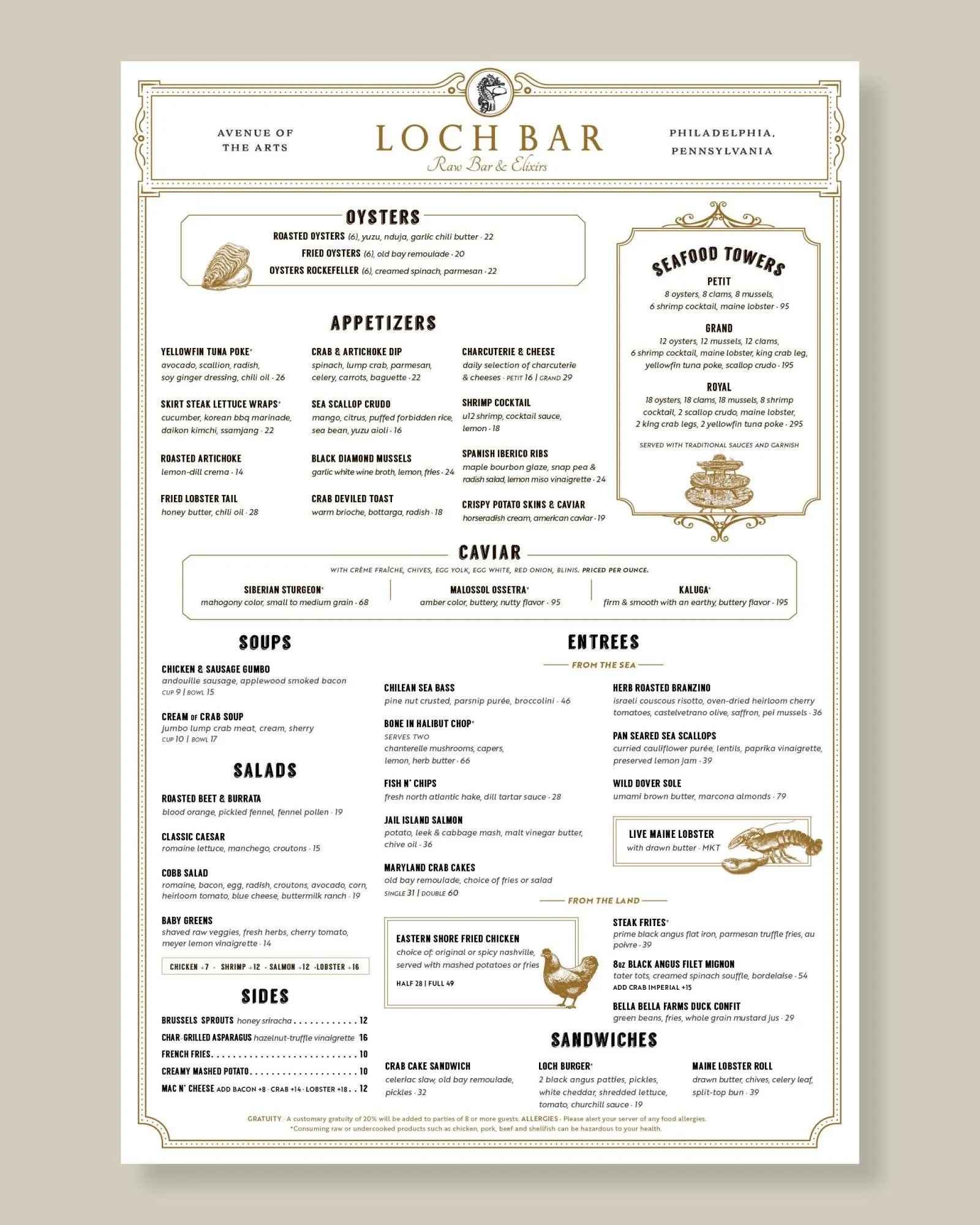 To enhance the menu for Loch Bar’s new restaurant in Philadelphia, a redesign was undertaken, incorporating their existing typefaces and brand colors. As a seafood tavern, a bespoke illustration of their renowned seafood towers was integrated, aligning with the established style seen in illustrations of chicken, lobster, and oysters. Consideration was given to the customer’s dining journey, strategically arranging courses from appetizers to entrees. Notably, the priciest item found its place in the top right corner, capitalizing on the natural focal point. The menu header drew inspiration from mental brackets and border elements reminiscent of vintage Philadelphia maps.